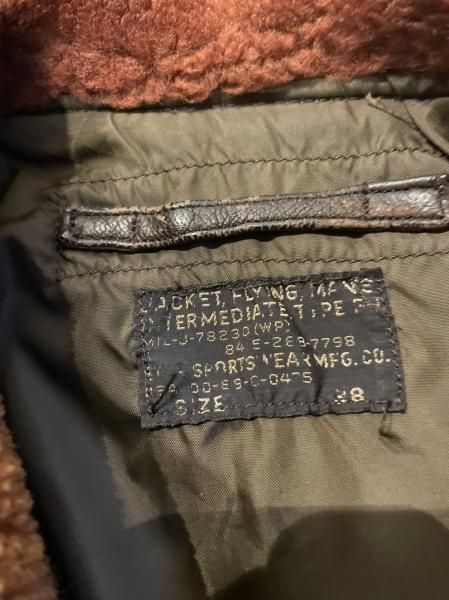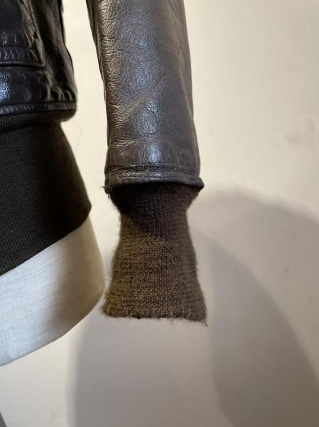69年製G-1レザーフライトジャケットです。 1963年に採用された【MIL-J-7823D】 (WP)で1971年に【MIL-J-7823DE】(AP)が制定されるまで作られたモデルです。70年代初期までの黒タグが付いています。 雰囲気のいい遣れかたをしているジャケットです。 革には擦れが有り、裏地は多少の汚れが有ります。 両袖リブが交換されています。 裾リブに小穴があります。 | |