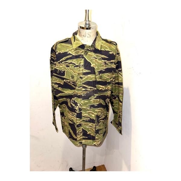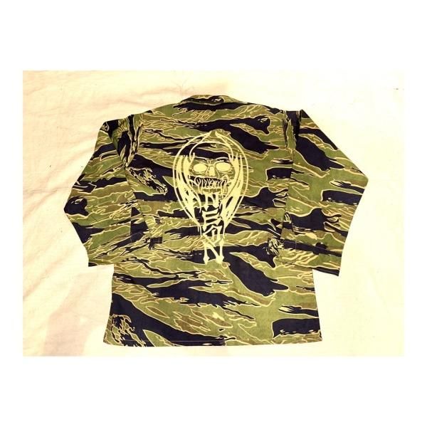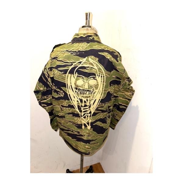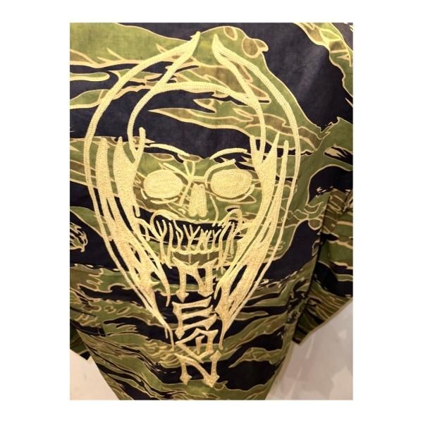 タイガーストライプ迷彩の シャツの背中に、1940年代のミシンでチェーンステッチでスカルウィングを入れました。 デザインを担当していただいたのは、tattooアーティストCxTxMのマサト氏になります。 先ずは、タイガーストライプの紹介を していきます。 【タイガーストライプ迷彩は60年代にベトナム戦争で多く使用されましたが、この迷彩は米軍のものではなく、南ベトナム政府軍が使用していたもので、そのデザインの良さからアメリカ軍の特殊部隊兵士を中心に現地市販物(日本、韓国製もあった)も含め兵士が勝手に着用していました。 タイガー・ストライプは、50年代のインドシナ紛争でフランス軍がベトナムに残していったリザード・パターン迷彩がルーツではないかと言われています。 また、1950年代後半から60年代当初にかけて、フランス軍の残していったリザード迷彩は南ベトナム政府軍が譲り受けて使用していましたが、やがて在庫不足となって困った政府軍は自前で現地生産を開始します。その時作ったリザード・パターン迷彩のコピー品がタイガーストライプ迷彩の元祖と言われているそうです。】 | |