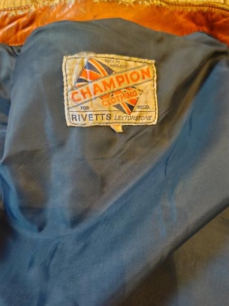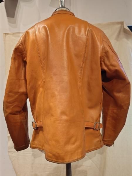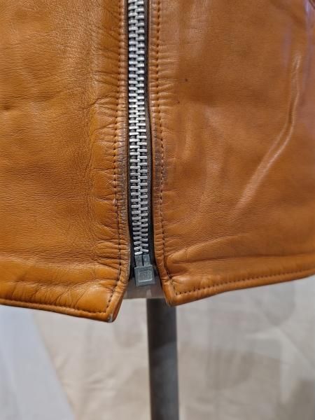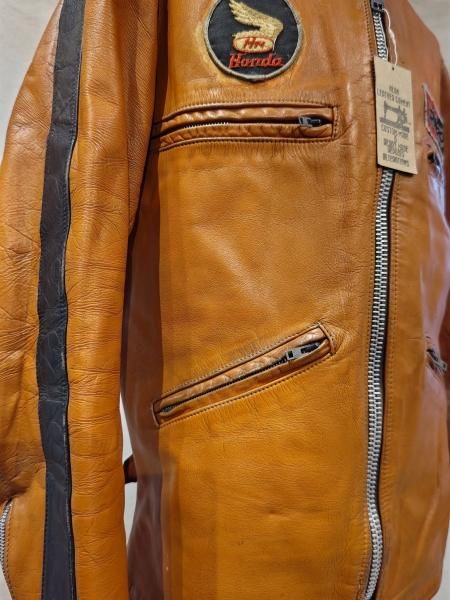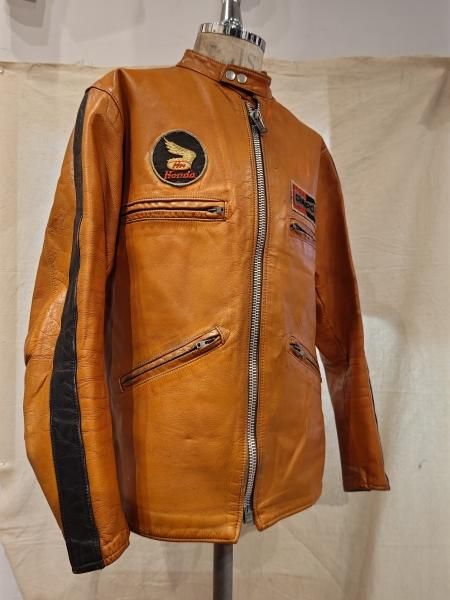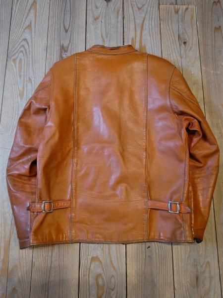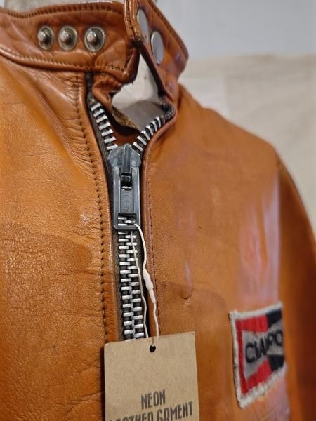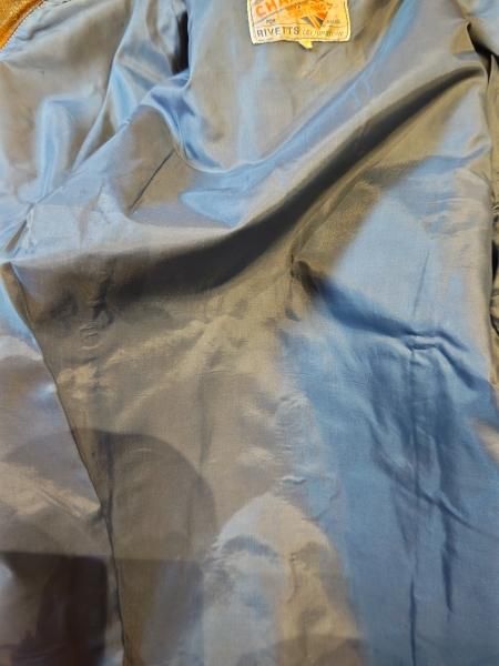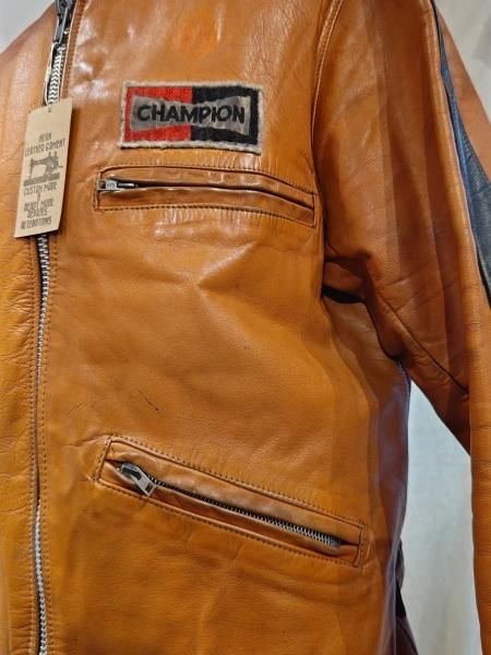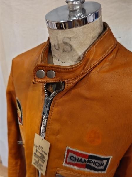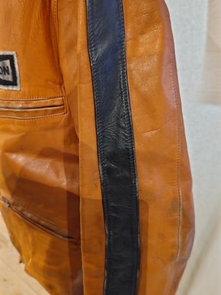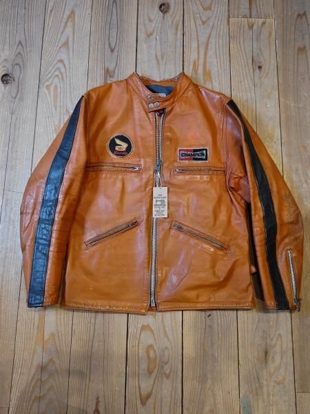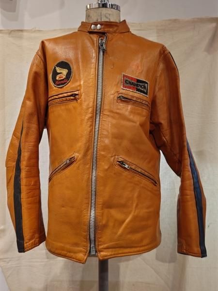 70年代CHAMPION RIVETTSのレザージャケットです。 フロントジッパーはCLIXです。 レザーの状態は、ステッチもしっかりとしています。 革スレは全体的にみられます。大きなダメージはみられません。 ファスナー稼動も問題ありません。前オーナーによりワッペンが縫い付けられています。 | |