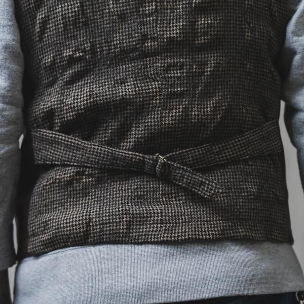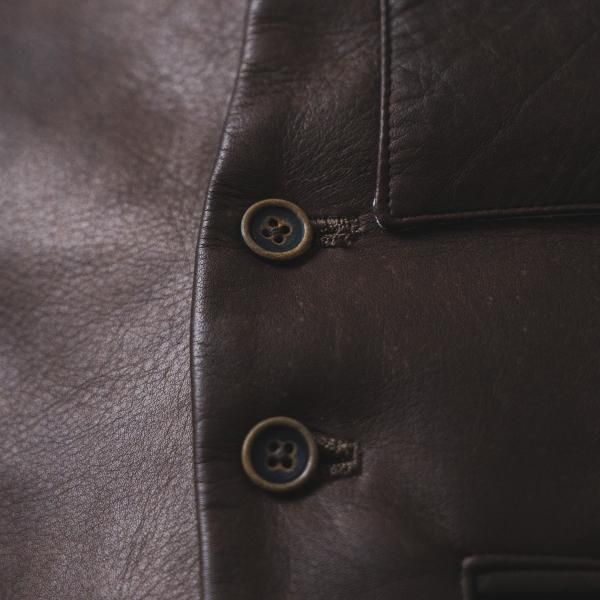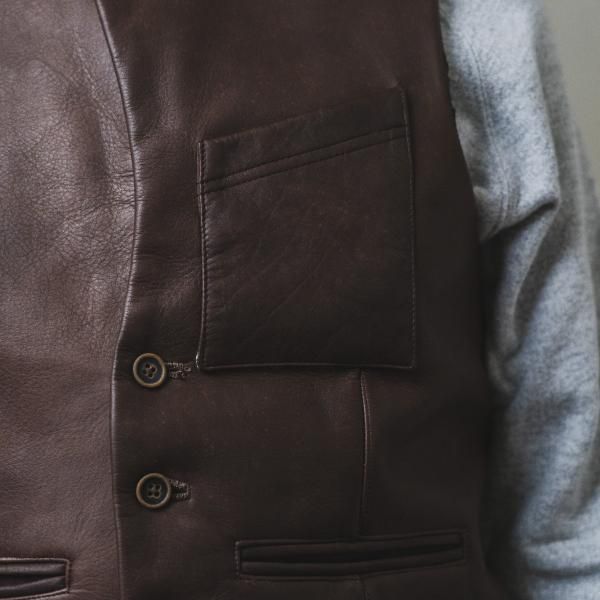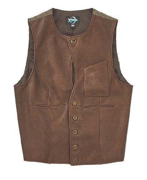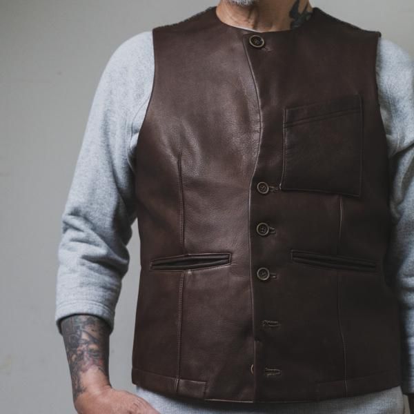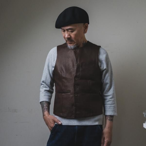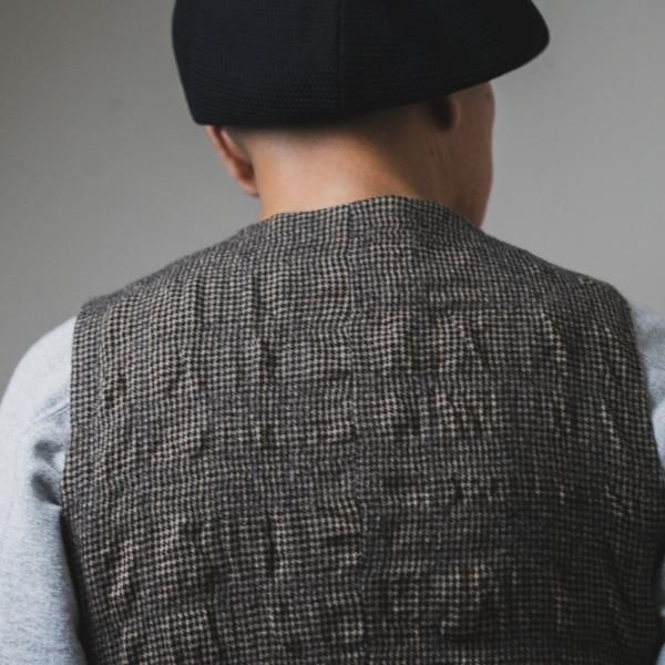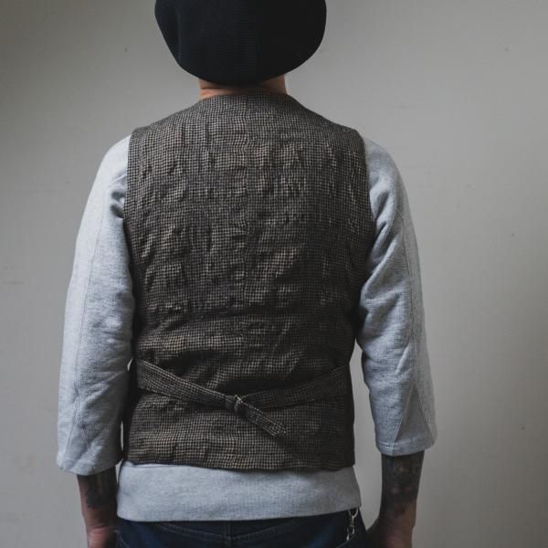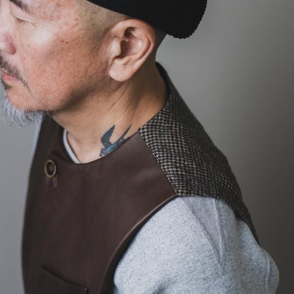 <商品説明> | 2015年、THEREスタート時にリリースしたリネン地のジレ”Bill the Butcher”のリ メイクアイテムです。 素材も前身はレザー、後身は千鳥柄のウール地を使いワイルドでありながらも フォーマルな雰囲気を漂わすThereならではのアイテムです。|