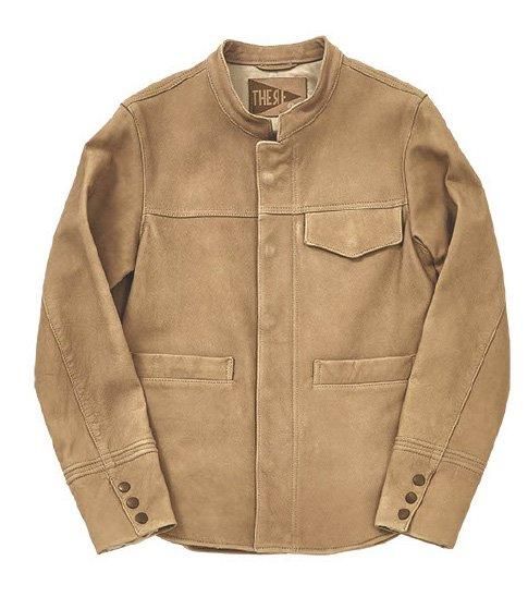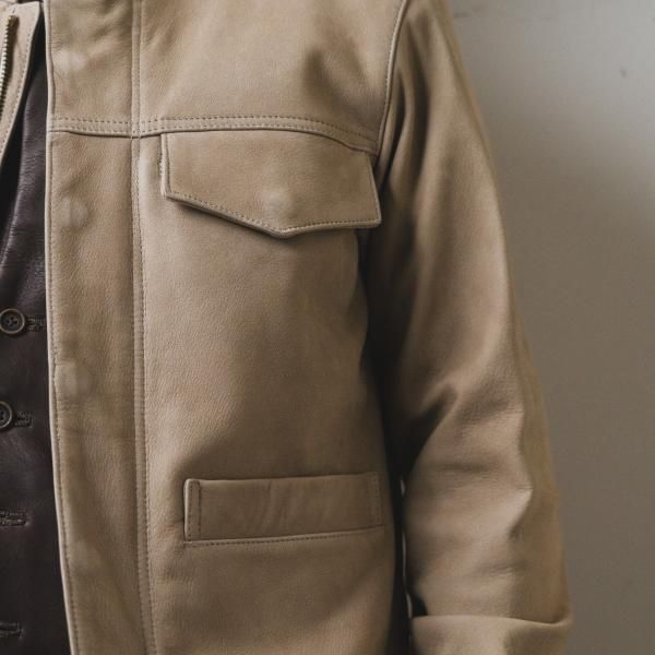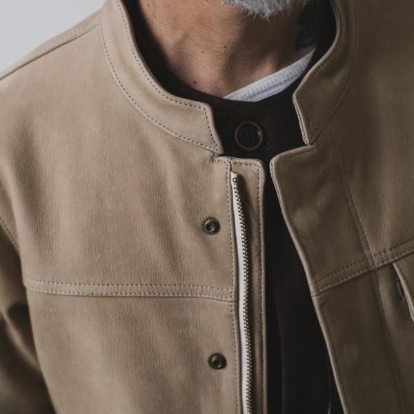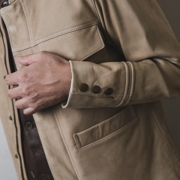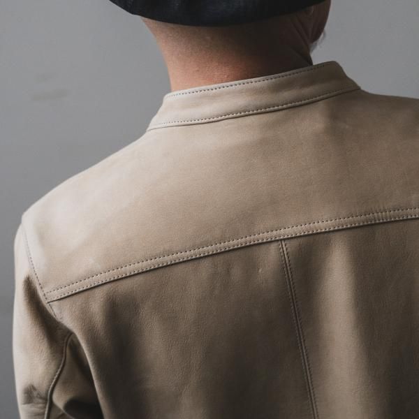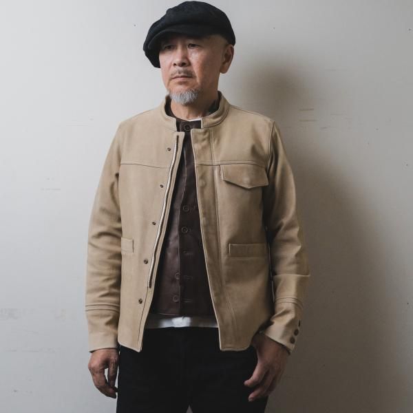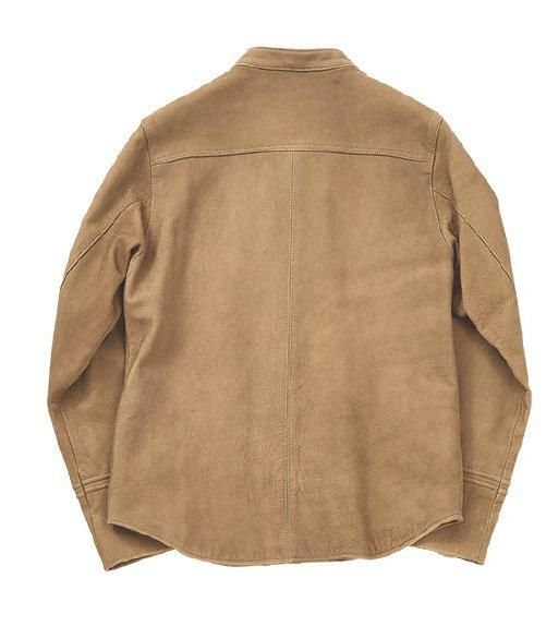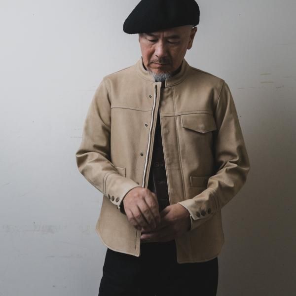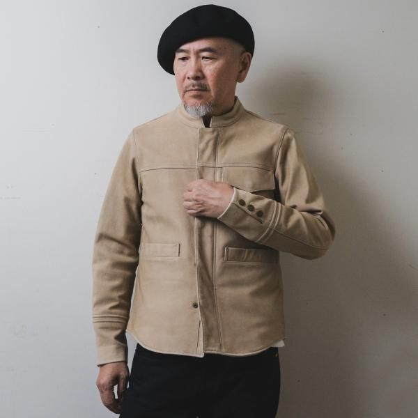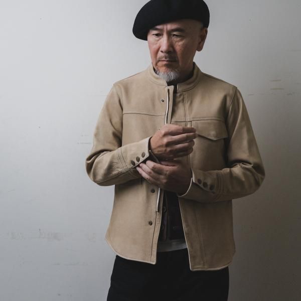 <商品説明> | ヌバックレザーを使用したスタンドカラーシャツジャケット。 袖カフス部の表地下に紐を縫い付けパイピングの様な膨らみがアクセントとなって います。 ネイティブアメリカンの英雄ジェロニモから着想デザインしたアイテムです。|