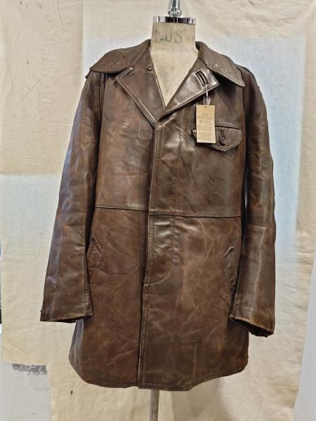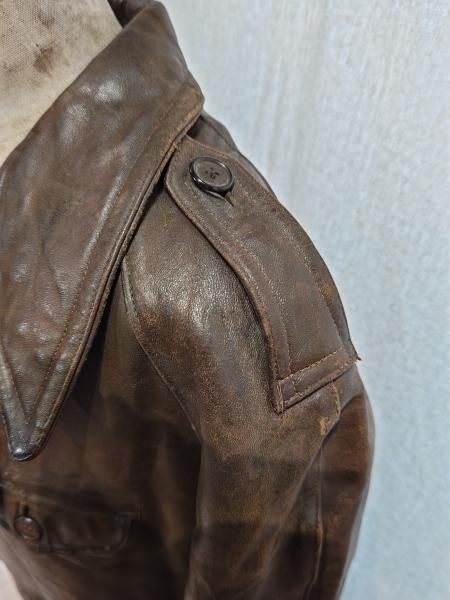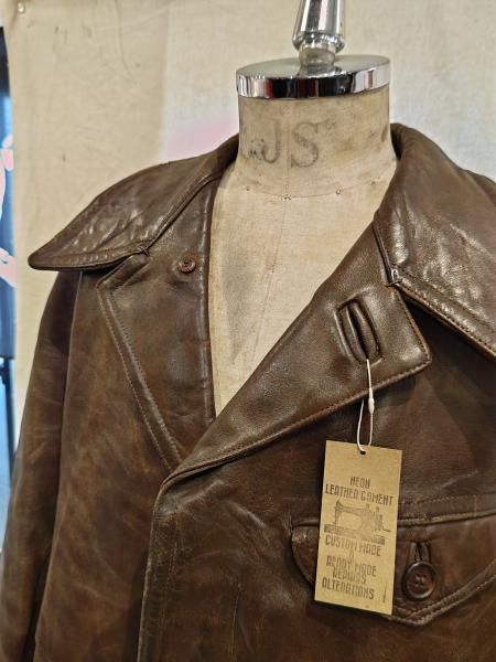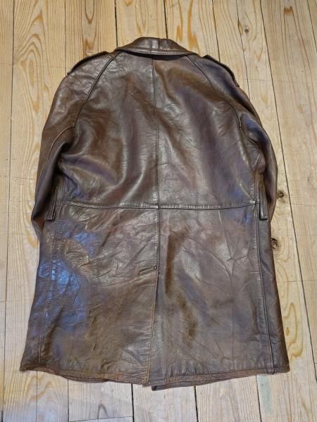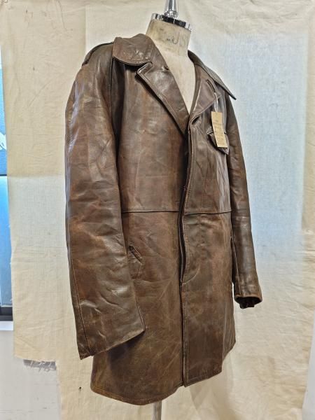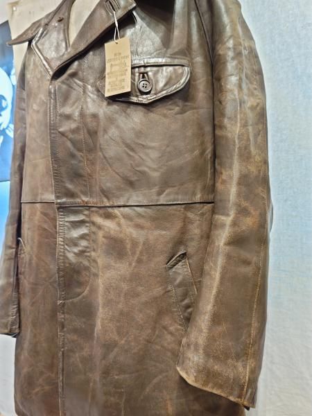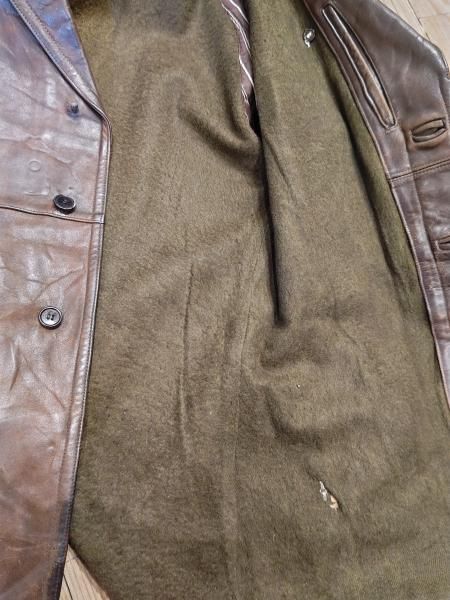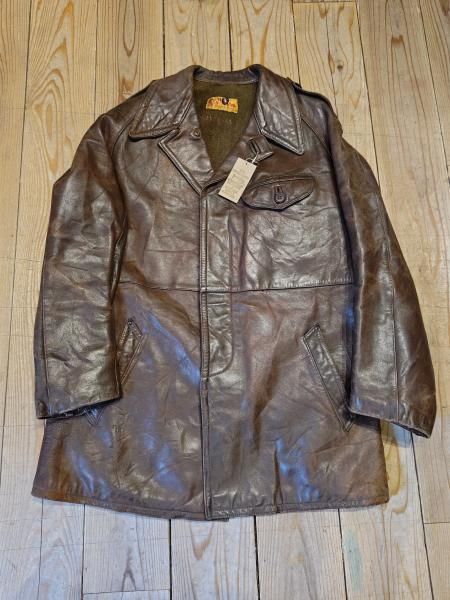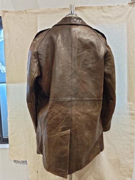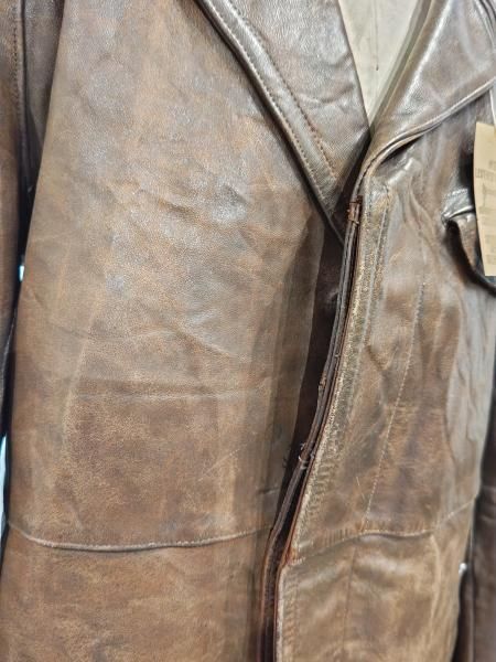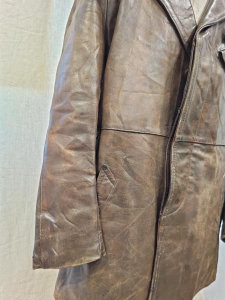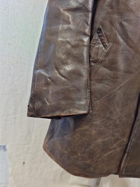 40年代フランス製NOEL CUIRのレザーコートです。 レザーの状態は概ね良好で、ステッチもしっかりとしています。革スレはみられますが、大きなダメージはみられません。第一ボタンが欠損しています。ベルトが欠品しています。 | |