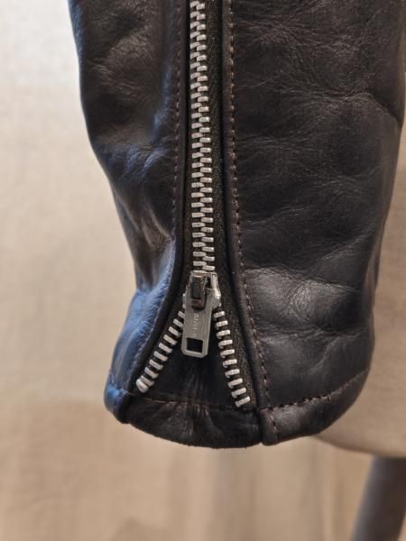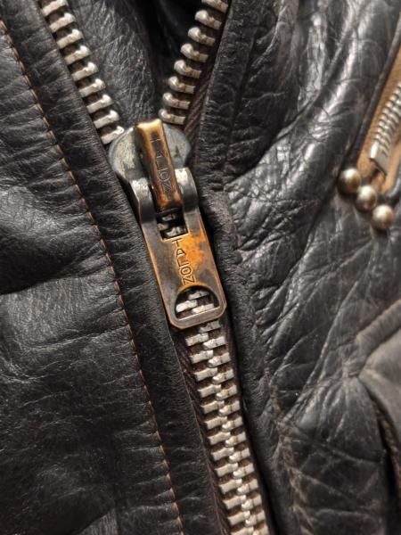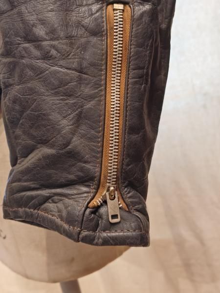 レザーの状態は、ステッチもしっかりとしています。 革スレは全体的にみられますが、大きなダメージはみられません。 ファスナー稼動も問題ありません。左袖ジッパーが交換されています。