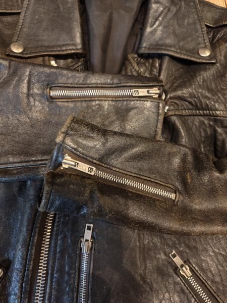70~80年代ヨーロッパ製のレザージャケットですメインジッパーはアルミYKKです。レザーの状態は、ステッチもしっかりとしています。 革スレは全体的にみられますが、大きなダメージはみられません。 ファスナー稼動も問題ありません。