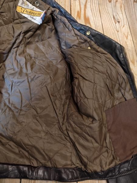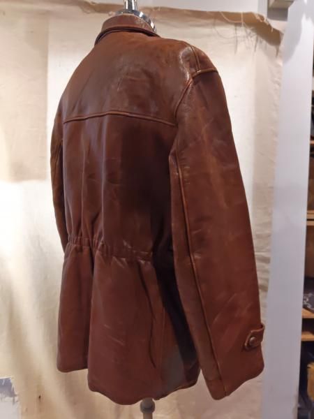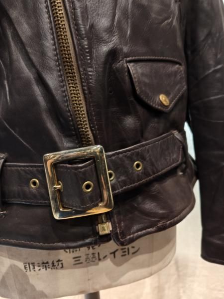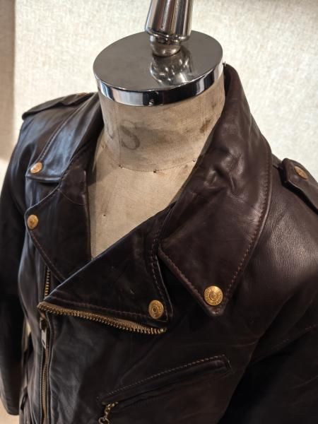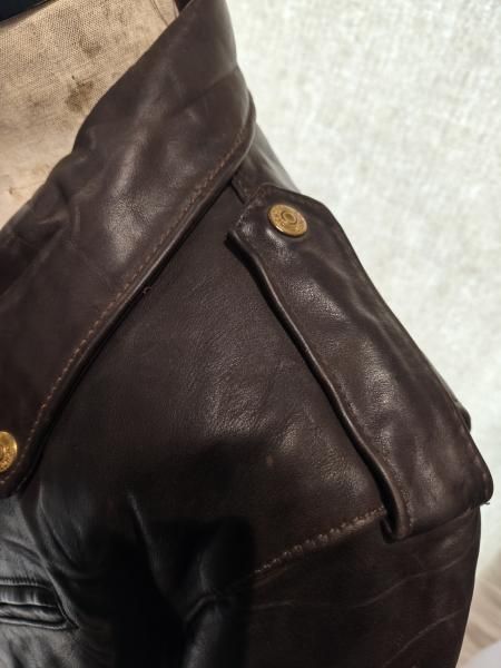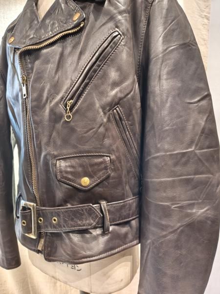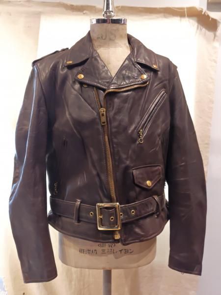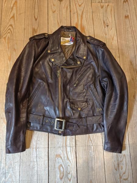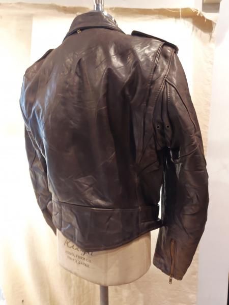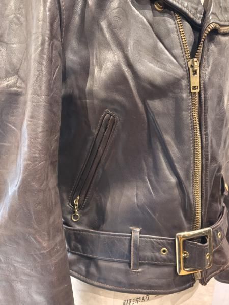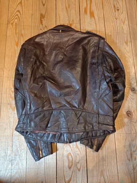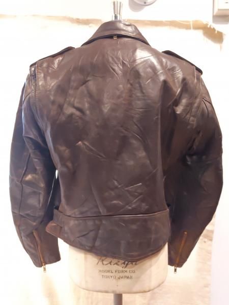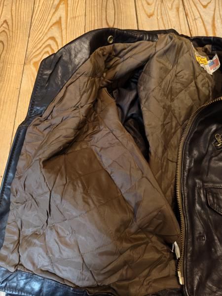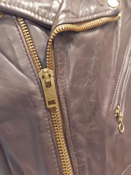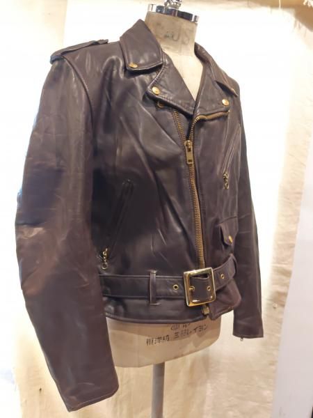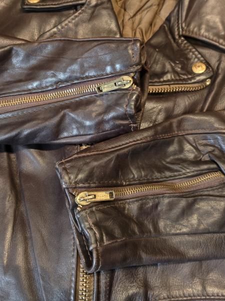 1980年代のショットです、モデル118Jです。 メインジップは交換されています、袖のジップはIDEALです。 レザーの状態は、ステッチもしっかりとしています。 革スレは少なく、大きなダメージはみられません。 | |