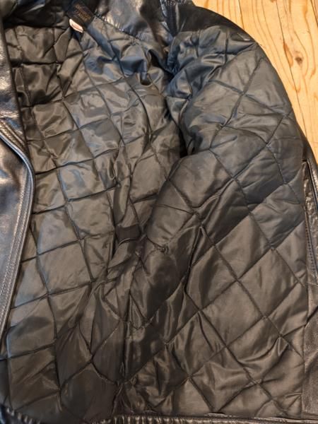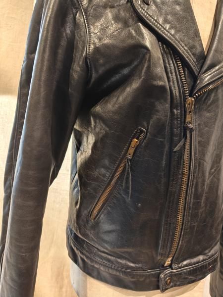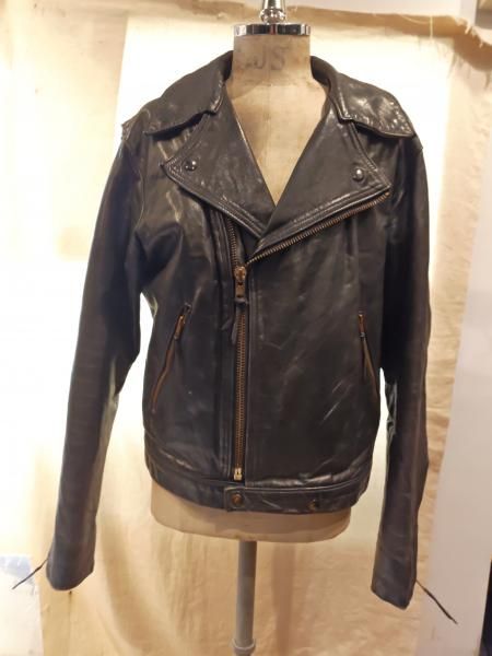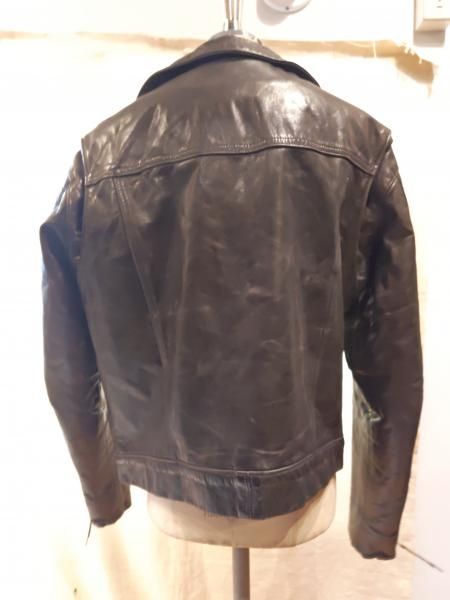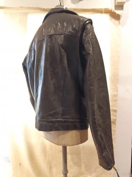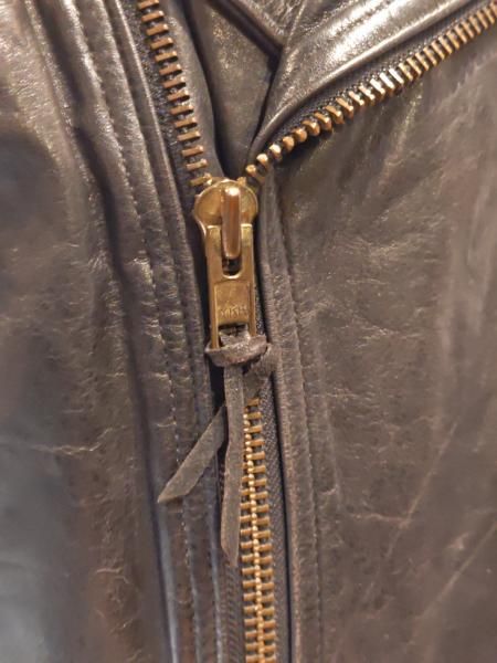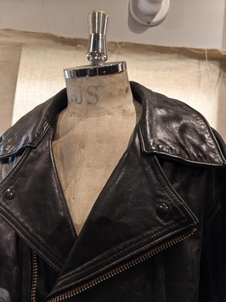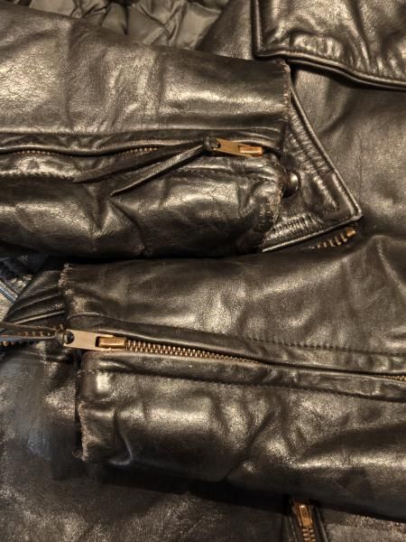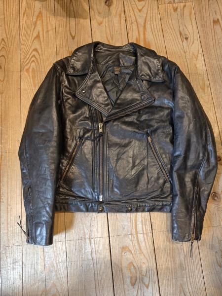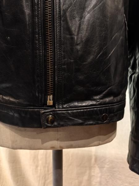 70年代米国製CHAMPLAIN LEATHERのレザージャケットです。 フロントジッパーはYKKです。レザーの状態は、革スレはみられますが大きなダメージはみられません。 ファスナー稼動も問題ありません。 ステッチもしっかりとしています。 | |