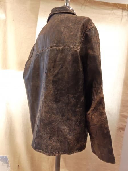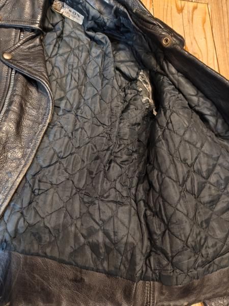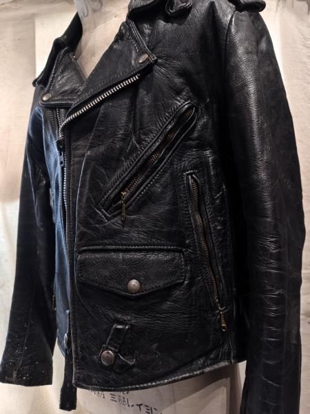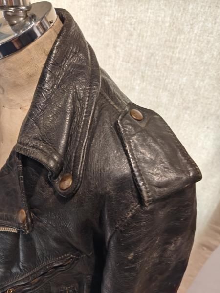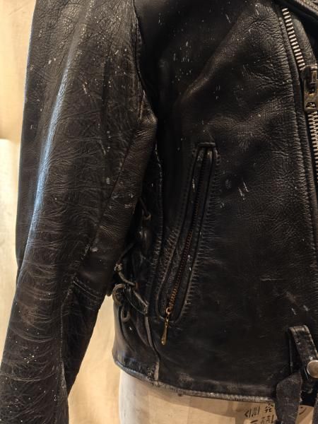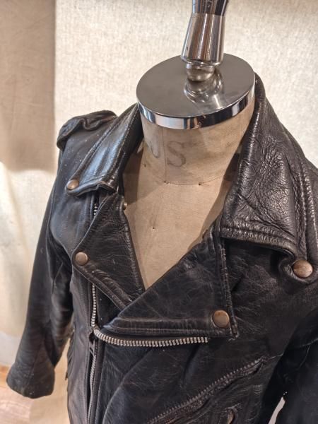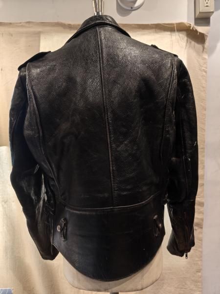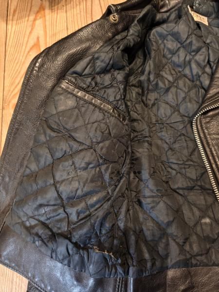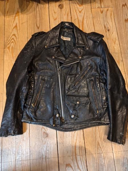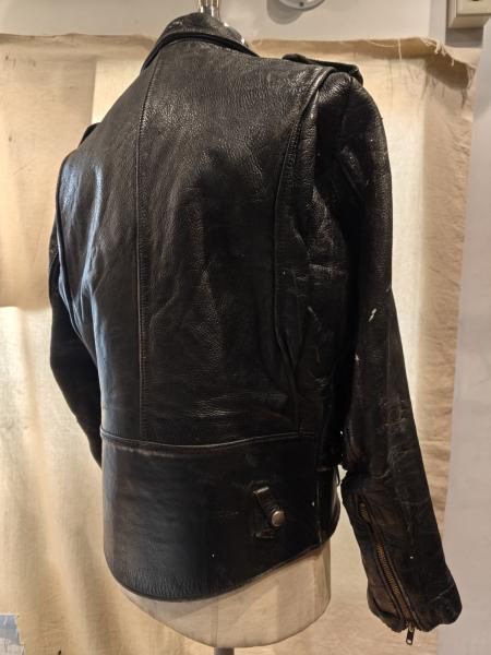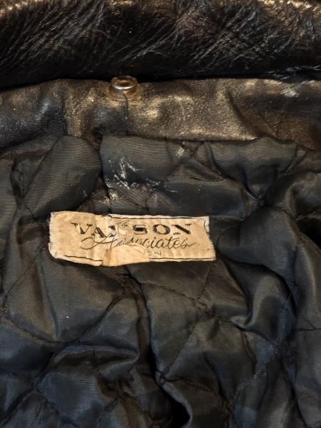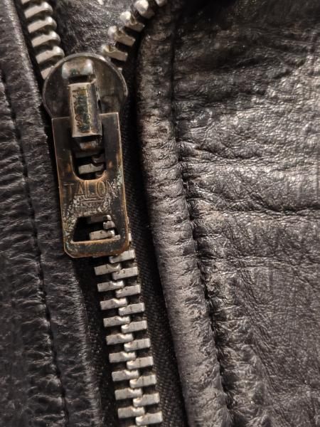 70年代のVANSONのレザージャケットです。 フロントジッパーはTALON、袖がTALONです。 レザーの状態は、ステッチもしっかりとしています。 革スレは少なめで、大きなダメージはみられません。腰のベルトが外されています。 | |