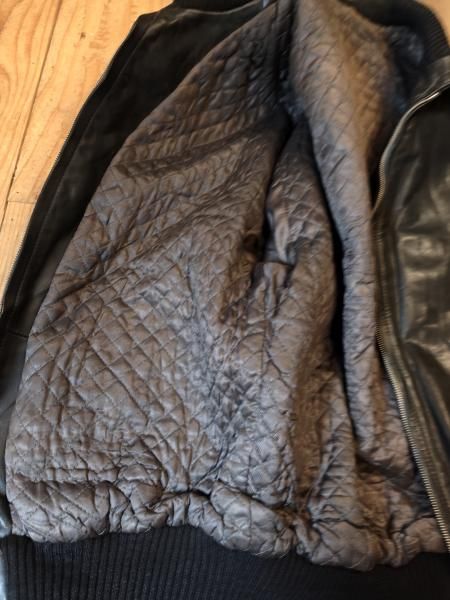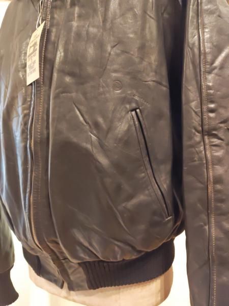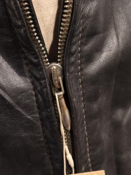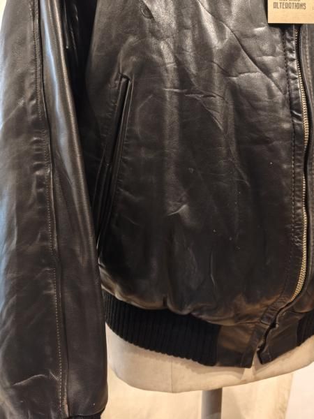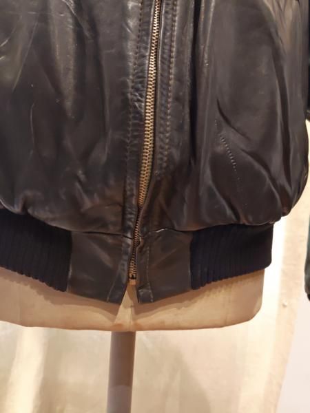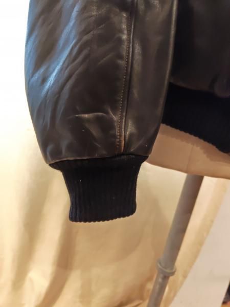 レザーの状態は、ステッチもしっかりとしています。 革スレは全体的にみられますが、大きなダメージはみられません。 ファスナー稼動も問題ありません。 袖、裾リブは交換済みです。
