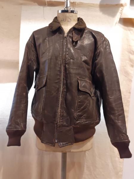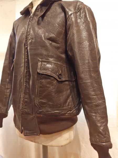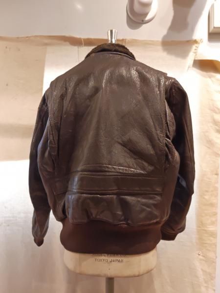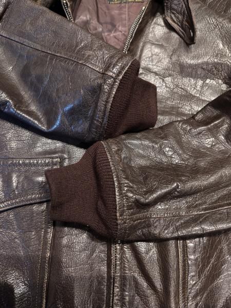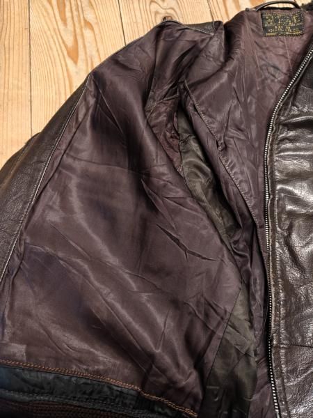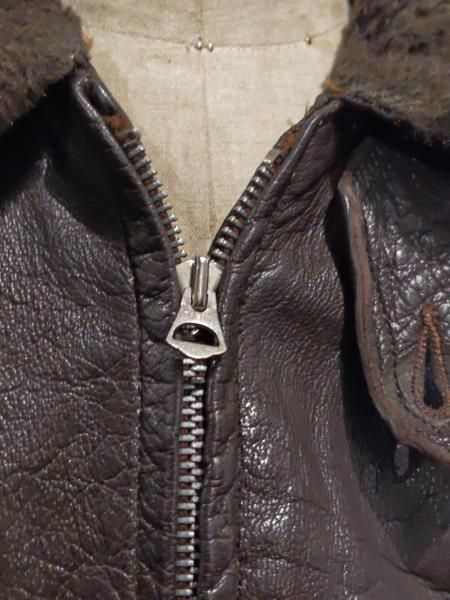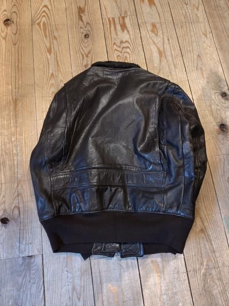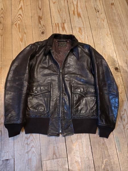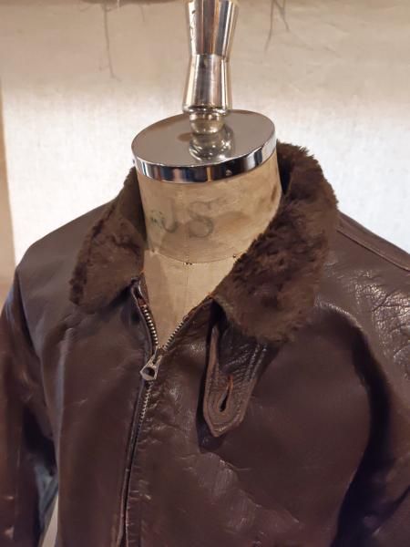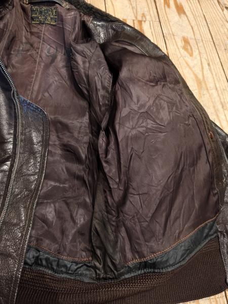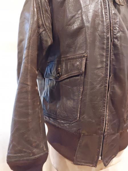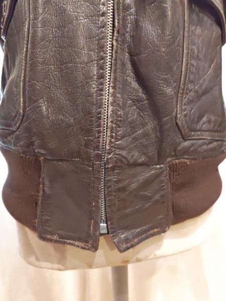 50年製G-1レザーフライトジャケットです。 G-1/MIL-J-7823は50年代初めに採用・支給された55J14の後継型です。 レザーの状態は、ステッチもしっかりとしています。 革スレは全体的に強くみられますが、大きなダメージはみられません。 ファスナー稼動も問題ありません。 裾、両袖リブが交換されています。 | |
